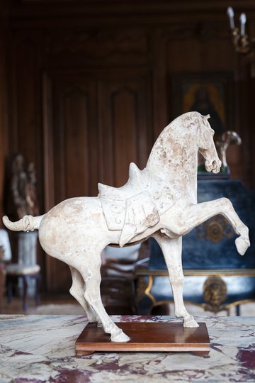 Les cornes indiquent qu’il s’agit d’un cheval-dragon, animal légendaire fruit d’un accouplement entre une jument et un dragon sorti de l’eau. En Chine, les meilleurs chevaux sont qualifiés de dragon. D’une rare élégance, celui-ci porte une selle avec des traces de polychromie.